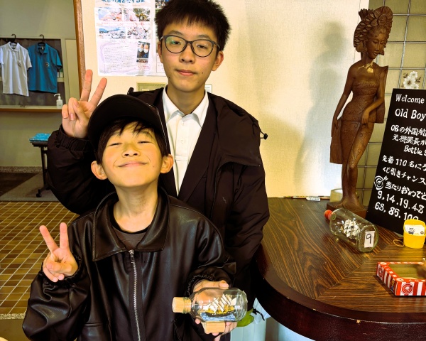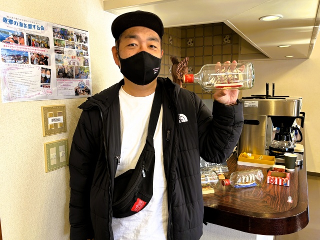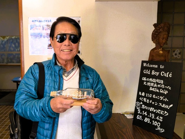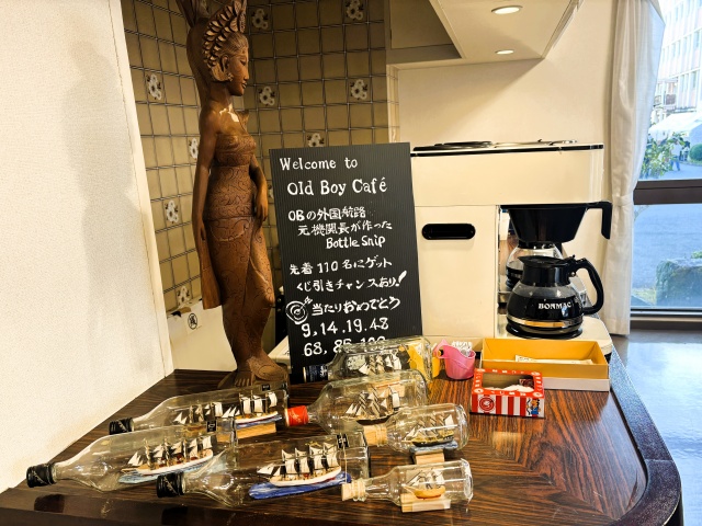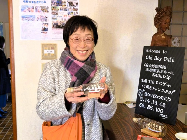 珈琲店の目玉は、昨年に引き続き小松隆幸氏(S43E)が制作したボトルシップで、目当てに珈琲を注文してくれる方も多数おり、くじ引きに当たった方はとても喜んでくださいました。